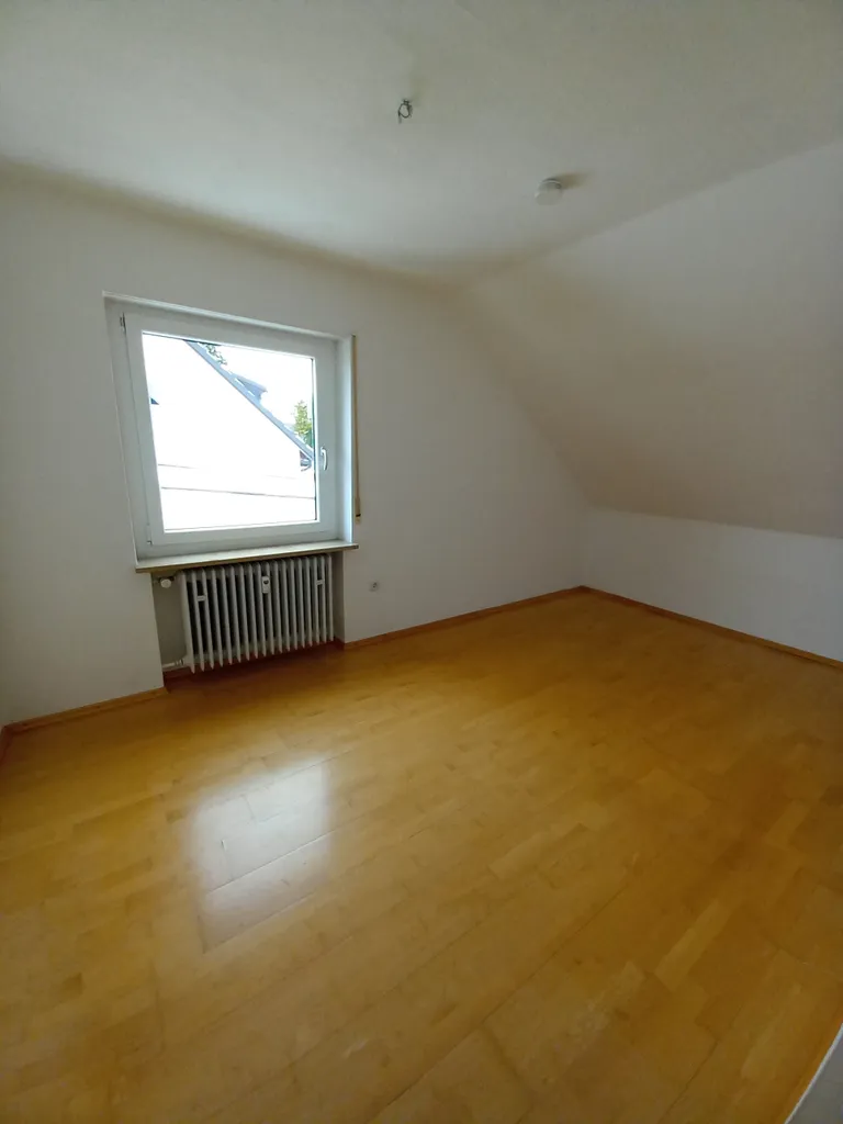 Diese Wohnung im Dachgeschoß eines Zweifamilienhauses verfügt über viel Platz. Zu den vier Zimmern gehört noch ein Abstellraum in der Wohnung und ein Kellerraum. Eine Waschküche ist vorhanden. Ein Stellplatz in der Garage kann angemietet werden.